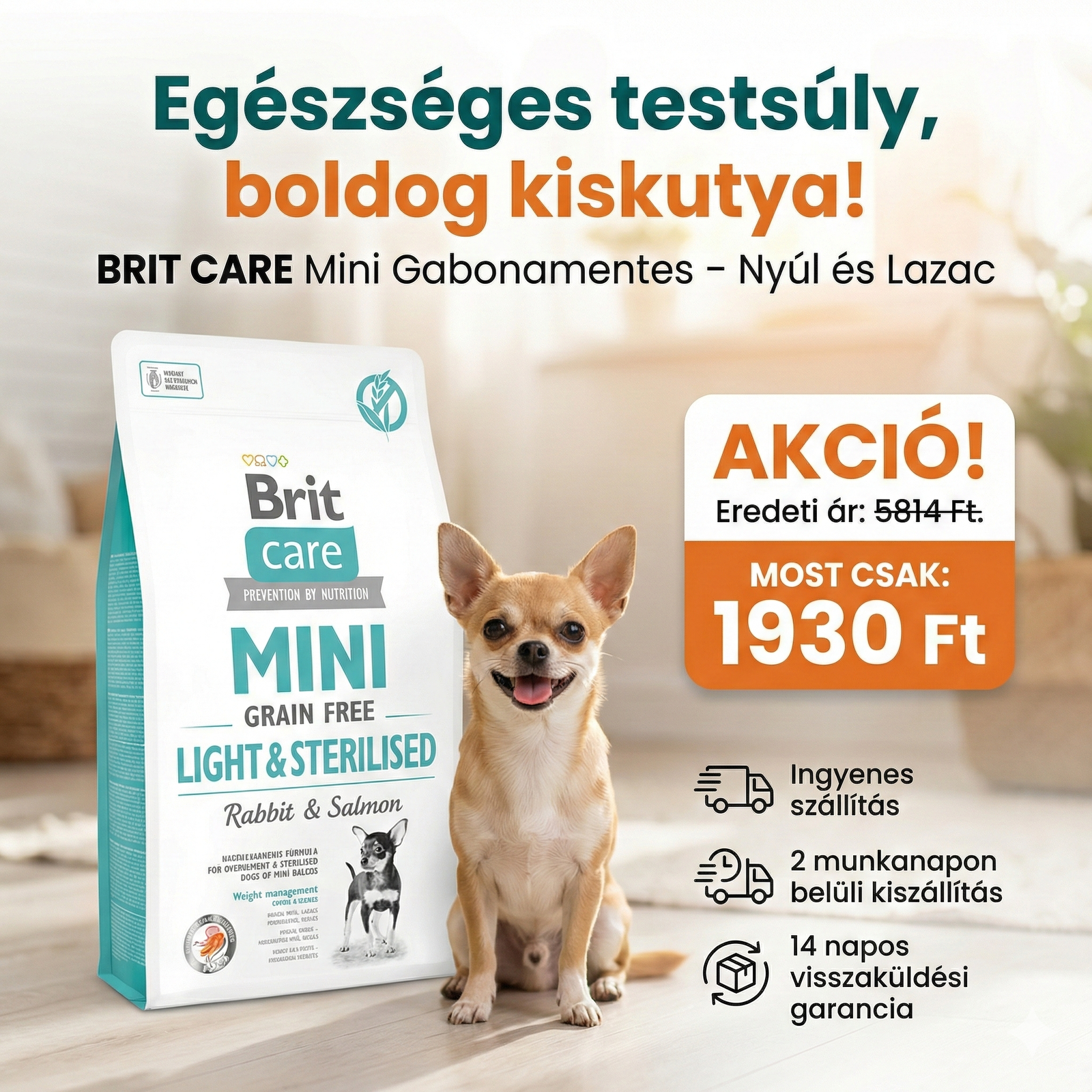 A Brit Care Mini Grain Free Light & Sterilised száraz kutyaeledel a miniatűr és kistestű fajták magas igényeinek megfelelő megoldás. Gabonamentes, hipoallergén összetételű, nyúllal és lazaccal. Az eledel túlsúlyos vagy elhízott állatok számára készült, ami különösen veszélyes az ilyen kistestű kutyák számára. A táplálék felnőtt, ivartalanított kutyák számára is alkalmas. Esetükben megvédi őket a lassabb anyagcserével járó súlygyarapodástól. A receptúra teljesen hipoallergén, így nem okoz túlérzékenységet vagy táplálékallergiát.